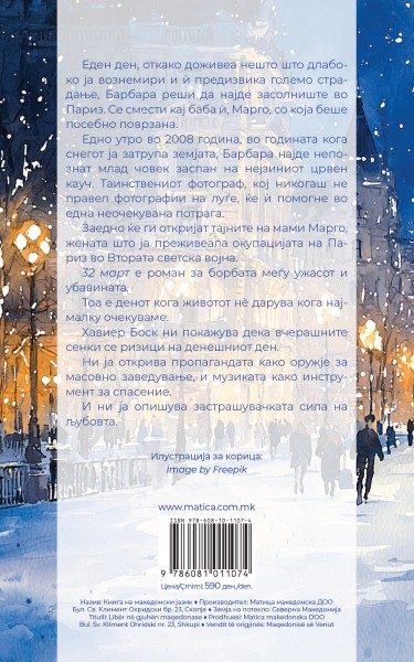 32 март е роман за борбата меѓу ужасот и убавината. Тоа е денот кога животот не дарува кога најмалку очекуваме. Хавиер Боск ни покажува дека вчерашните сенки се ризици на денешниот ден. Ни jа открива пропагандата како оружје за масовно заведување, и музиката како инструмент за спасение. И ни ја опишува застрашувачката сила на љубовта.