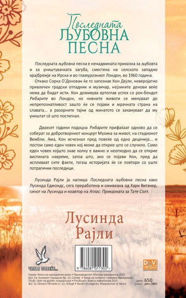 "Последната љубовна песна" е ненадмината приказна за љубовта и за уништувачката загуба, сместена на селското западно крајбрежје на Ирска и во гламурозниот Лондон, во 1960 година. Откако Сорка О’Донован ќе го запознае Кон Дејли, неверојатно привлечен градски отпадник и музичар, нејзините денови веќе нема да бидат исти. Кон доживува вртоглав успех со рок-бендот Рибарите во Лондон, но нивните животи се менуваат до непрепознатливост зашто ќе се појави и мрачната страна на славата… а разорните тајни од минатото се закануваат да му уништат сè што постигнал.
